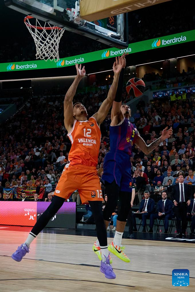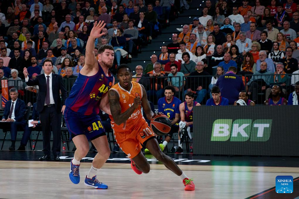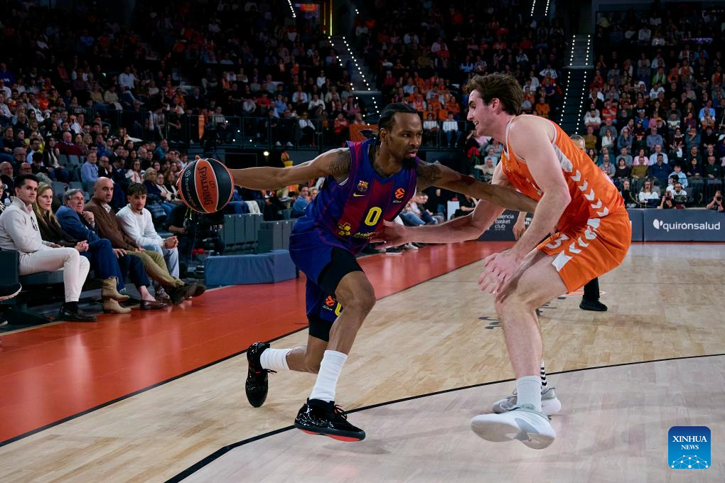 Omari Moore (R) of Valencia competes against Joel Parra of Barcelona during the Euroleague basketball match between Valencia and Barcelona in Valencia, Spain, on March 19, 2026. (Photo by Pablo Morano/Xinhua)