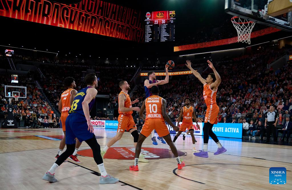 Joel Parra (C) of Barcelona competes during the Euroleague basketball match between Valencia and Barcelona in Valencia, Spain, on March 19, 2026. (Photo by Pablo Morano/Xinhua)