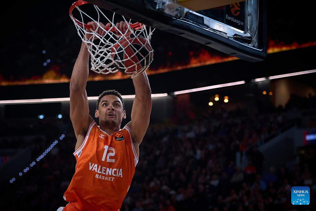 Neal Sako of Valencia dunks during the Euroleague basketball match between Valencia and Barcelona in Valencia, Spain, on March 19, 2026. (Photo by Pablo Morano/Xinhua)