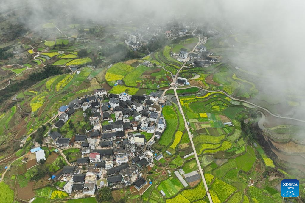 An aerial drone photo taken on March 18, 2026 shows a view of Taichen Village in Danzhai County, southwest China's Guizhou Province. (Photo by Yang Wukui/Xinhua)