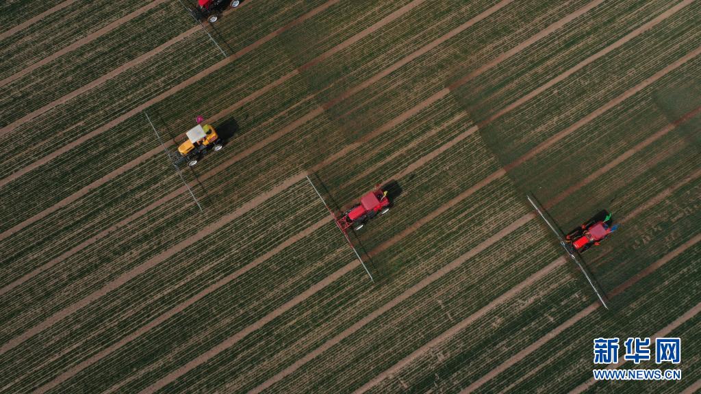 噴霧機(jī)在河北省辛集市試炮營村麥田里進(jìn)行除草作業(yè)(2020年3月17日攝,無人機(jī)照片)。