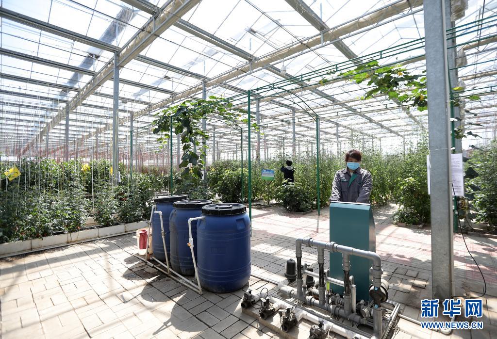 河北省饒陽縣一家現(xiàn)代農(nóng)業(yè)示范園區(qū)工人在智慧溫室操作水肥一體化設(shè)施(2020年4月8日攝)。近年來,河北省饒陽縣在推進農(nóng)業(yè)供給側(cè)結(jié)構(gòu)性改革中,積極優(yōu)化農(nóng)業(yè)產(chǎn)業(yè)結(jié)構(gòu),依托現(xiàn)代農(nóng)業(yè)示范園區(qū)建設(shè),將自動滴灌、遠程數(shù)據(jù)采集、智能電力溫控等先進“工業(yè)化”技術(shù)應(yīng)用于農(nóng)業(yè)生產(chǎn)。