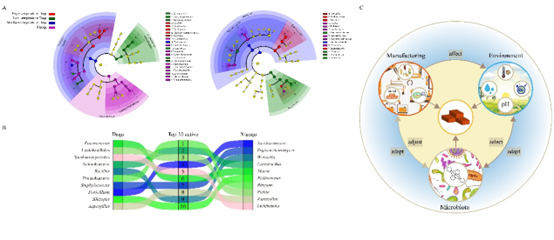 长期生产实践与科学研究表明,外部环境因子与内部微生物相互作用是共同维系制曲微生态稳定的关键要素,调节与控制该系统的稳定性对曲的质量起着关键作用,对后续酿造过程具有重要影响。近年来蓬勃发展起来的微生物组学技术在制曲微生态研究上取得了一系列重要进展,比如不同曲中微生物群落组成及形成机制研究,揭示了制作工艺、发酵环境和地理生态等因素对功能微生物菌群的选择作用,明确了外部环境因子对制曲过程中微生物群落形成及代谢的影响(图1)。相对外部环境因子的驱动作用,2022年12月,北京工商大学孙宝国院士团队王柏文、孙金沅、郝慧宜等在国际食品科技期刊《国际食品微生物学杂志》(International Journal of Food Microbiology)(1区,IF: 5.911)发表了题为“中国白酒发酵过程中挥发性有机化合物介导的内源性微生物相互作用”(Volatile organic compounds mediated endogenous microbial interactions in Chinese baijiu fermentation)的研究论文,介绍了白酒制曲过程中功能微生物的互作机制及潜在调控策略,探讨了群落内部相互作用对维持制曲微生态稳定的影响。