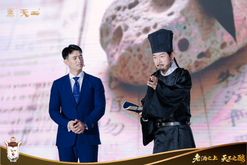 发布会现场,《天工开物》元素如流动的文化血脉贯穿始终。外场的竹简卷轴阵列与活字印刷装置,将“乃粒”“曲蘖”等酿酒篇章转化为可触摸的历史肌理——竹简上镌刻着“凡酿酒必资曲药成信”的古籍原文,活字模块拼贴出“天工开物”“拾贰年陈”等核心概念,形成时空交织的文化场域。内场的沉浸式舞台上,演员化身为宋应星与当代酿酒师,在“天人共酿”的对话中,重现典籍中“水泉必香,曲蘖必时”的酿造智慧。当“明代科学家”手持《天工开物》竹简,与现代酿酒师的陶坛、曲块形成跨时空呼应,舞台中央的巨型沙漏缓缓流淌,象征着三百年工艺传承的时间重量。