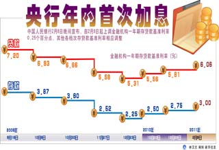 央行選取這個時點加息,不禁讓人聯(lián)系到統(tǒng)計局將于近日公布的1月份CPI,市場普遍預計CPI會超過5%的高點。專家認為,今年央行可能還將有三至四次加息,同時還會繼續(xù)上調(diào)存款準備金率。 [詳細]