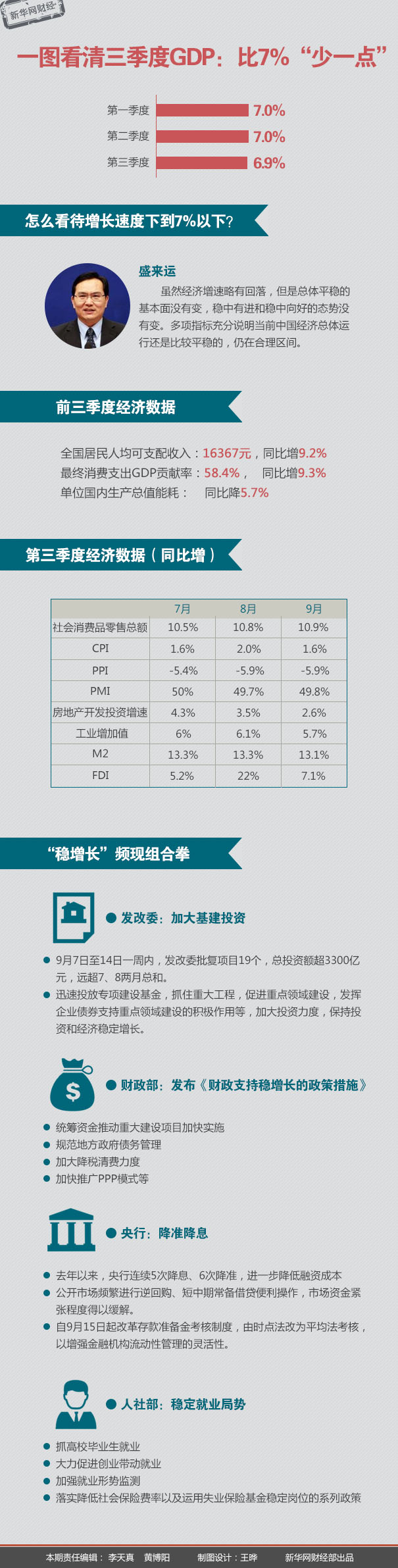 ????新華網北京10月19日電(記者 徐曼曼)備受關注的中國經濟“三季報”今日揭開面紗。國家統(tǒng)計局數(shù)據(jù)顯示,三季度GDP同比增幅為6.9%,創(chuàng)下自2009年以來的最低增速,系官方首次以分季方式核算的GDP數(shù)據(jù)。初步核算,前三季度國內生產總值487774億元,按可比價格計算,同比增長6.9%。