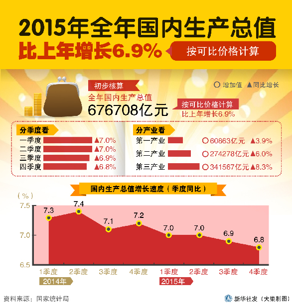 ??? 新華網(wǎng)北京1月19日電(陳凱茵 萬方)中國經(jīng)濟2015全年成績單今日出爐。據(jù)國家統(tǒng)計局數(shù)據(jù),2015年國內(nèi)生產(chǎn)總值676708億元,比上年增長6.9%。國家統(tǒng)計局局長王保安表示,2015年經(jīng)濟保持了總體平穩(wěn)、穩(wěn)中有進、進中有創(chuàng)、創(chuàng)中提質(zhì)的發(fā)展態(tài)勢。