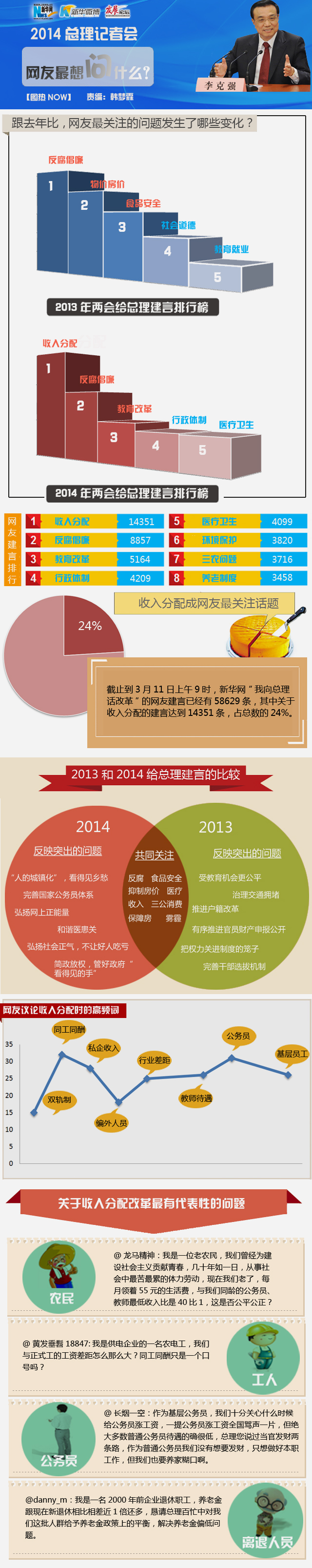 3月13日上午,國務院總理李克強將與中外記者見面,回答大家的問題。這是李克強總理第二次總理記者會,今年新華網推出了大型互動專題"我和總理話改革",收到了數萬條網友建言,在這些建言中,哪些問題是網友最關心的,如果是網友在記者會上提問,他們最想問什么?