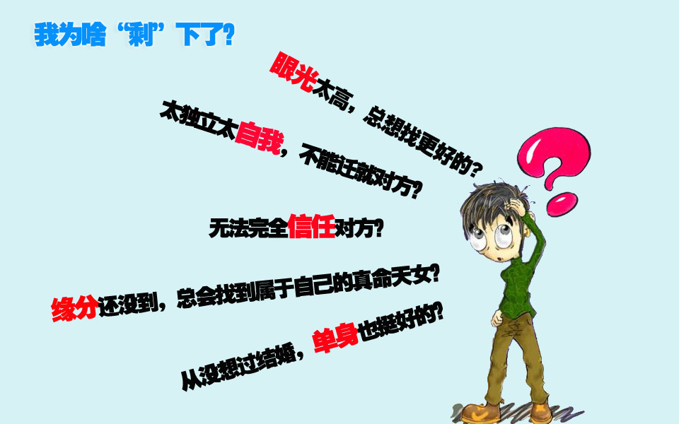 @沙礫:其實(shí),這年頭,沒(méi)有無(wú)緣無(wú)故的剩男,出來(lái)混,總是有因有果的,別光抬頭看天,有時(shí)也要低頭看看路,更要平時(shí)看看周圍的人。 別總占著一枝花,心里想著整個(gè)花園,到頭來(lái)啥也沒(méi)剩,把自己剩下了!