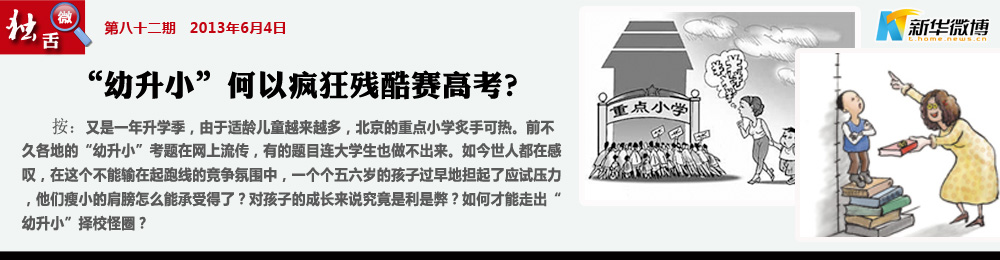 【孩子精神分裂】 A校搞面談,B??紛W數(shù),C??粗夭潘?,D校要英語會話,孩子們考前往往要精神分裂好長一段時間,學(xué)生進一次校門就得背一次考試圣經(jīng)。