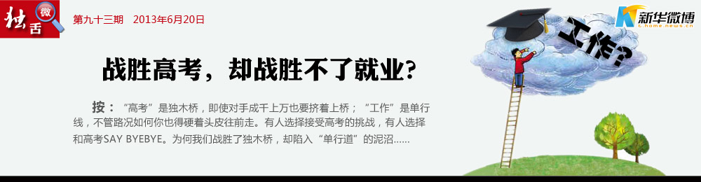 花費(fèi)了高昂的學(xué)習(xí)成本、浪費(fèi)了寶貴的年華、經(jīng)歷了非人的摧殘,結(jié)果戰(zhàn)勝了高考,卻陷入“就業(yè)難”的泥沼。當(dāng)很多大學(xué)生面臨畢業(yè)就失業(yè)、起薪比農(nóng)民工還低的時候,曾一直縈繞在耳邊的“高考成功、人生美滿”的話語,怎么變成了一記耳光、一個笑話?
