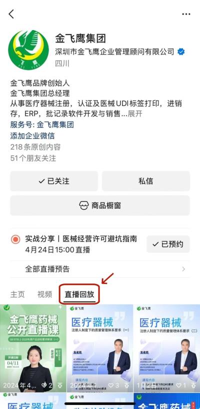 往期直播培訓(xùn)課程支持回放,關(guān)注“金飛鷹藥械咨詢服務(wù)”視頻號(hào)并點(diǎn)擊視頻號(hào)主頁(yè),即可查看“直播回放”哦~