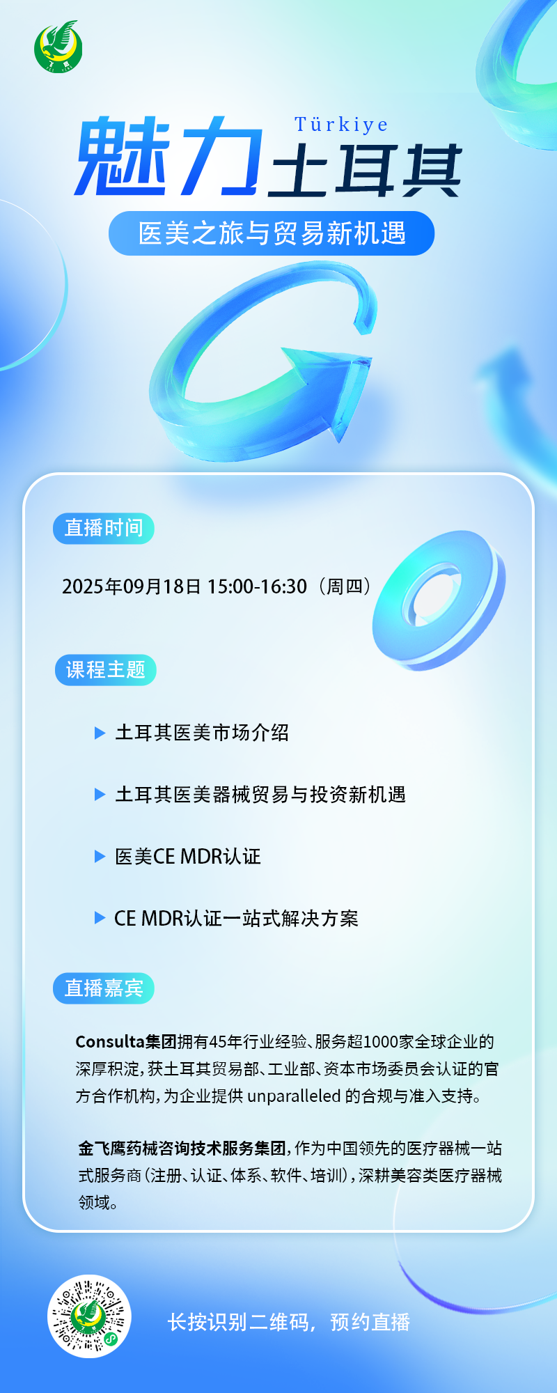 2025年9月18日(周四)下午15:00,金飛鷹藥械咨詢技術(shù)服務(wù)集團(tuán)將攜手土耳其Natural Clinic、Consulta Group、Investo Global等多家戰(zhàn)略合作伙伴,聯(lián)合舉辦“魅力土耳其:雙軌掘金——醫(yī)美之旅與貿(mào)易新機(jī)遇”線上分享交流會(huì),為您全面揭開土耳其市場(chǎng)的無(wú)限潛力!
