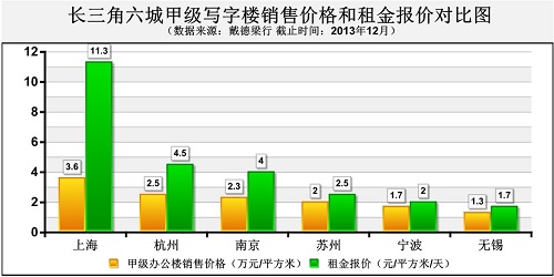 僅以蘇州為例,其甲級(jí)辦公寫(xiě)字樓的平均售價(jià)已奔至“2字頭”;租金報(bào)價(jià)與南京同類物業(yè)的差距也已縮小至1.5元/平方米/天。 |