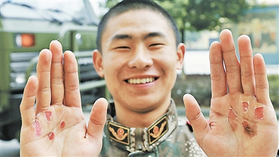 ??? 武警四川省總隊樂山市支隊官兵在嚴(yán)格訓(xùn)練中得到鍛煉。圖為2014年12月14日,戰(zhàn)士楊忠微笑著展示自己的訓(xùn)練“成果”。李華時 攝