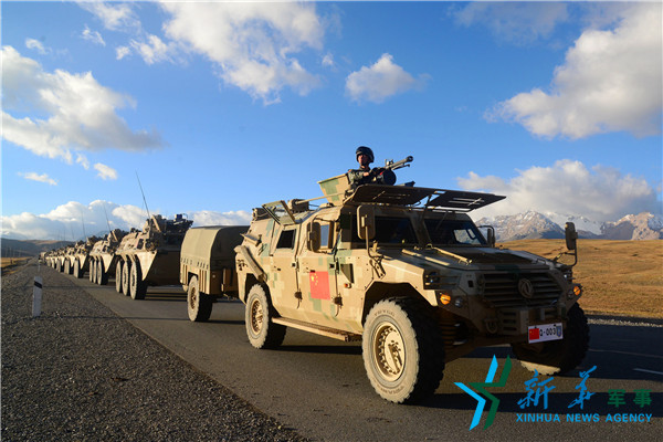 ????9月13日,我地面參演部隊(duì)采取摩托化機(jī)動方式,于9月12日從新疆阿圖什市出發(fā),經(jīng)吐爾尕特邊境口岸出境,行程共約510公里,于9月13日抵達(dá)演習(xí)地域。新華社記者王德思 攝