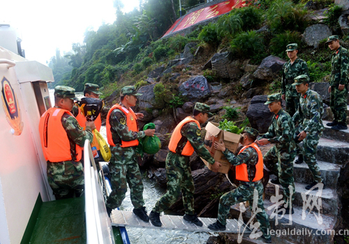 圖為官兵們將日用品用巡邏艇沿湄公河送到第一哨位執(zhí)勤點