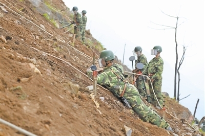 ??? 2月6日,云南省軍區(qū)掃雷指揮部掃雷四隊(duì)官兵系著繩索,在陡峭的雷場(chǎng)進(jìn)行人工搜排作業(yè)。嚴(yán)浩 攝
