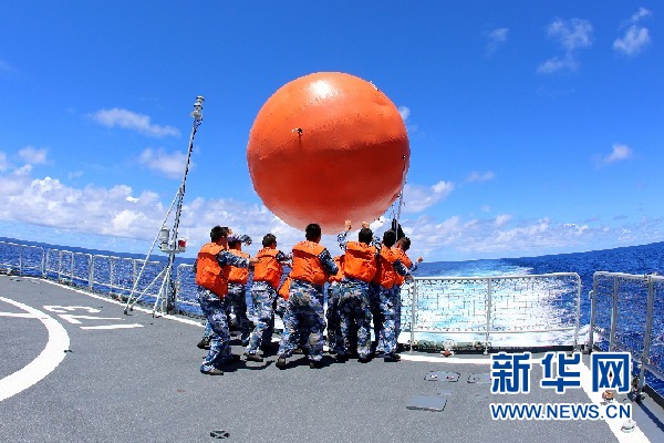 2月19日,在海上現(xiàn)場反擊演練中,長沙艦艦員在飛行甲板上向指定海域布放模擬“敵艦”的漂浮靶標。