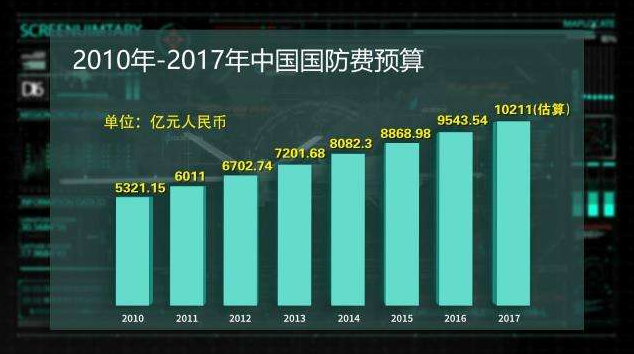 自1999年超過1000億元人民幣,到2017年突破10000億元人民幣,中國的國防實力上了一個新臺階,國防建設與經濟建設協(xié)調發(fā)展進入了一個新階段。