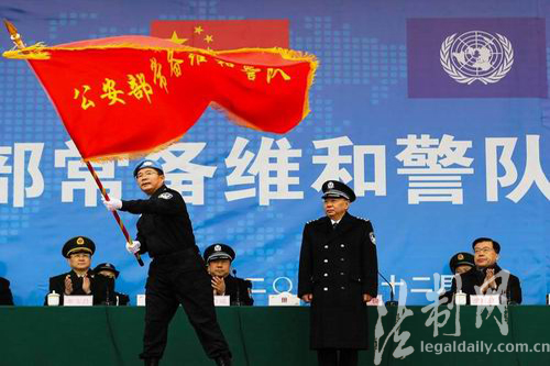 圖為公安部部長(zhǎng)助理王儉為常備維和掛牌成立授旗