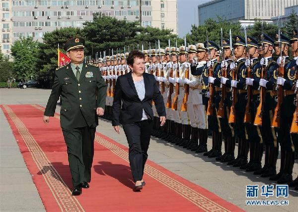 5月16日,國務(wù)委員兼國防部長常萬全在北京與波斯尼亞和黑塞哥維那國防部長瑪麗娜·彭黛什舉行會談。會談前,常萬全為彭黛什舉行歡迎儀式并陪同檢閱中國人民解放軍三軍儀仗隊。新華社記者 劉芳 攝