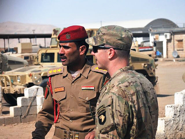 2016年9月6日,伊拉克斯威夫特營地,美軍打擊部隊軍官與伊拉克軍官交談。(新華/美聯(lián))