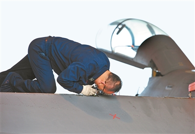 7月7日下午,空軍某飛訓(xùn)基地組織跨晝夜飛行。戰(zhàn)機(jī)歸來后,一名機(jī)械師單膝跪在機(jī)翼上,臉緊貼戰(zhàn)機(jī)縫隙檢查動作筒有無漏油。由于工作需要,機(jī)務(wù)人員經(jīng)常需要彎腰低頭、鉆進(jìn)狹小機(jī)艙,有時一彎就是小半天,很容易患上腰肌勞損等常見病,但為了讓飛機(jī)不“帶病”上天,這名機(jī)械師把身體彎成了與座艙蓋相似的弧度。徐晨桐、靳翚淇 攝影報道