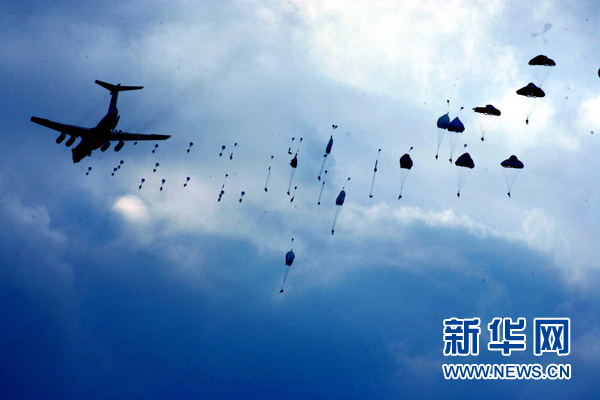 2005年8月24日,參加“和平使命-2005”中俄聯(lián)合軍事演習(xí)第三階段兩棲登陸作戰(zhàn)實兵課目演練的中國空降兵部隊在實施傘降。新華社記者 查春明 攝