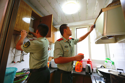 圖為江蘇鎮(zhèn)江邊防檢查站臨退老兵為老人擦拭廚房碗柜、油煙機(jī)