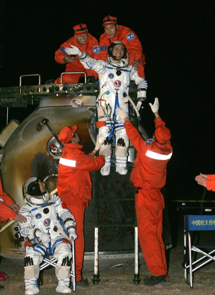????2008年9月28日,神舟七號(hào)返回地球,航天員翟志剛、劉伯明、景海鵬(從左至右)自主出艙后向現(xiàn)場(chǎng)搜救人員揮手致意。新華社記者 王建民 攝