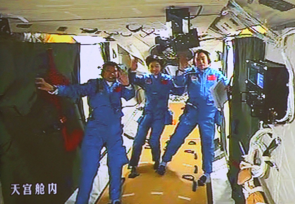 ????2012年6月18日,北京航天飛控中心大屏幕顯示航天員景海鵬、劉洋、劉旺(從右至左)在天宮一號(hào)實(shí)驗(yàn)艙內(nèi)。新華社記者 查春明 攝