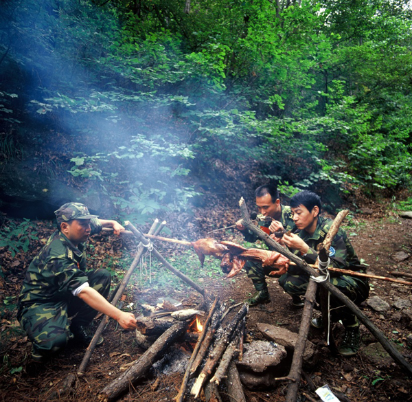 ????2006年9月16日,航天員費(fèi)俊龍(中)在遼寧進(jìn)行叢林野外生存訓(xùn)練。新華社發(fā)(朱九通 攝)