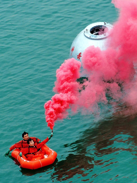 ????2005年10月17日,神舟六號(hào)返回艙在內(nèi)蒙古四子王旗中部草原成功著陸,首先出艙的航天員費(fèi)俊龍看著聶海勝出艙。新華社記者 王建民 攝