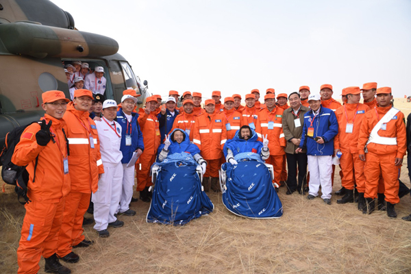 ????2016年11月18日,航天員景海鵬(左)、陳冬在四子王旗著陸場(chǎng)順利返回。新華社發(fā)(孔方舟 攝)