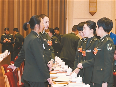 ??? 三月七日上午,出席十三屆全國人大二次會議的解放軍和武警部隊代表團(tuán)舉行第一次全體會議。會議間隙,女代表們相互討論交流。解放軍報記者 馮凱旋攝