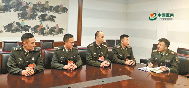 ????解放軍報記者孫興維(右一)采訪軍隊人大代表楊初格西、楊磊、齊虎廣、謝正誼(左一至左四)。尹繼冬 攝