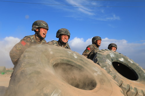 ????武警新疆總隊某機動支隊特戰(zhàn)一中隊組織官兵進行翻輪胎體能訓(xùn)練(10月30日攝)。新華社發(fā)(張文 攝)