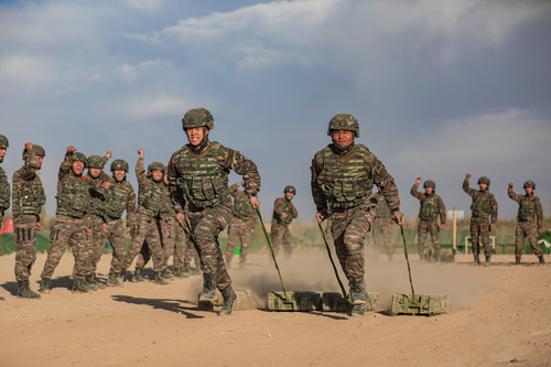 ????武警新疆總隊某機動支隊特戰(zhàn)一中隊組織官兵進行搬運子彈箱體能訓(xùn)練(10月30日攝)。新華社發(fā)(張文 攝)
