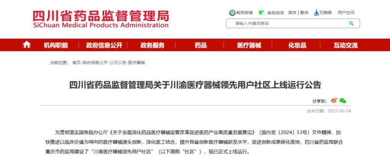 該社區(qū)平臺的開發(fā)上線是落實國務(wù)院辦公廳《關(guān)于全面深化藥品醫(yī)療器械監(jiān)管改革促進醫(yī)藥產(chǎn)業(yè)高質(zhì)量發(fā)展意見》(國辦發(fā)〔2024〕53號)文件精神的重要舉措。四川省藥監(jiān)局相關(guān)負責人表示,今后將持續(xù)拓展優(yōu)化社區(qū)平臺功能,逐步擴大行業(yè)用戶覆蓋面,進一步整合省內(nèi)臨床和醫(yī)療器械研發(fā)資源,為醫(yī)療器械創(chuàng)新研發(fā)提供全方位、全過程的服務(wù)支撐,助力臨床研究成果轉(zhuǎn)化,營造良好醫(yī)療器械創(chuàng)新生態(tài)。