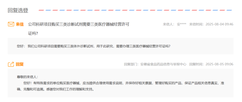 根據(jù)安徽省藥監(jiān)局的答復(fù),有特殊需求的單位購買醫(yī)療器械,應(yīng)當提供合理使用需求說明,并保存好相關(guān)票據(jù),管理好購買的產(chǎn)品,保證產(chǎn)品相關(guān)信息真實、準確、完整和可追溯。