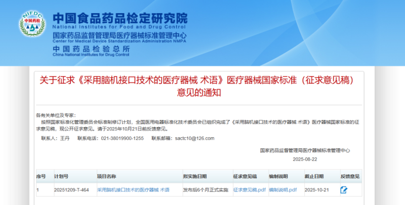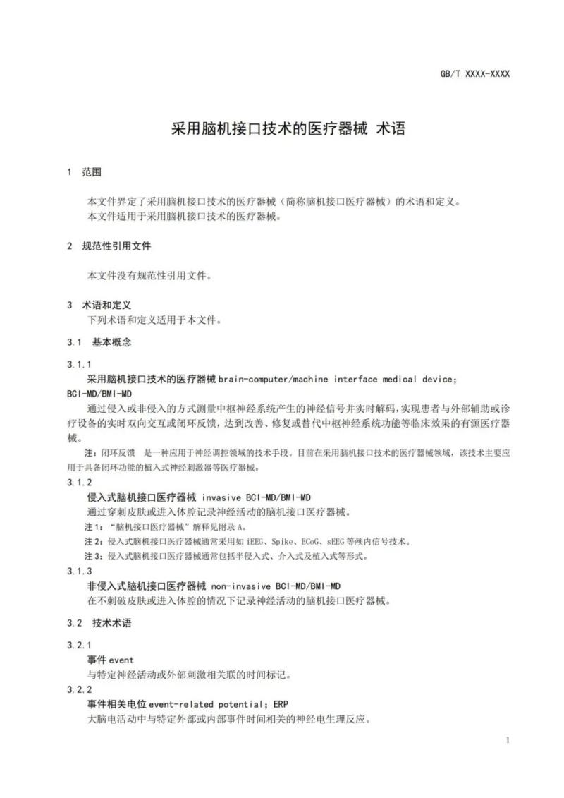 近日,國家藥品監(jiān)督管理局醫(yī)療器械標(biāo)準(zhǔn)管理中心發(fā)布《采用腦機接口技術(shù)的醫(yī)療器械 術(shù)語》醫(yī)療器械國家標(biāo)準(zhǔn)的征求意見稿,并向社會公開征求意見,同時提到,該標(biāo)準(zhǔn)將于發(fā)布后6個月正式實施。