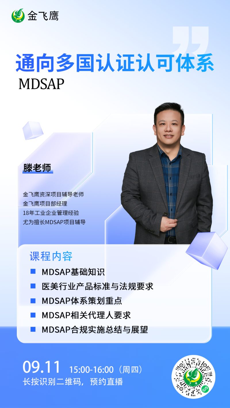 9月11日下午3點,金飛鷹高級項目咨詢師、有著諸多MDSAP項目輔導(dǎo)經(jīng)驗的滕老師,給大家深入淺出地講解MDSAP審核的核心邏輯與應(yīng)對技巧,讓您不僅“知其然”,更“知其所以然”!感興趣的朋友記得提前預(yù)約,鎖定這場合規(guī)必修課!