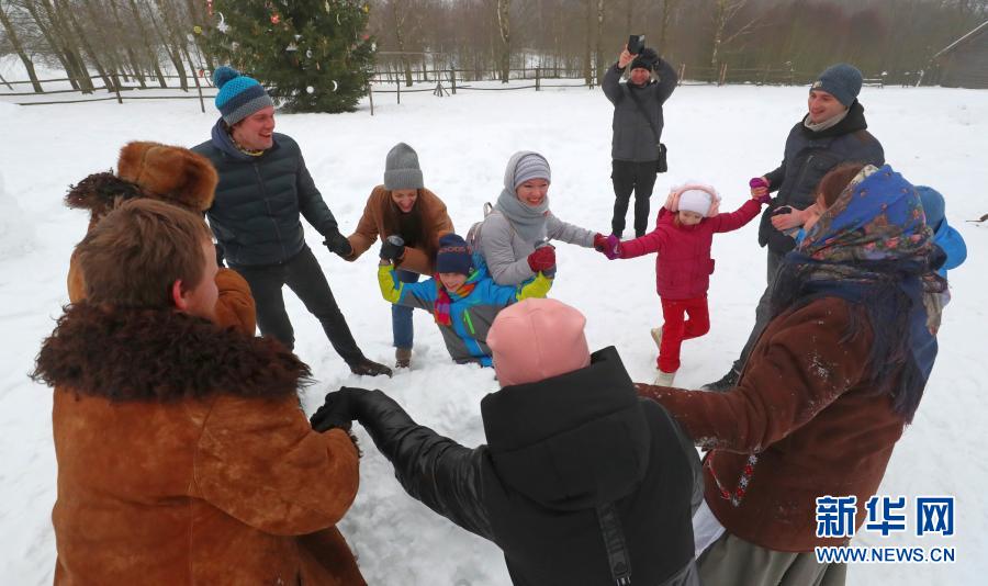 1月24日,人們在白俄羅斯首都明斯克郊區(qū)的民族建筑博物館內(nèi)圍成圈跳舞。新華社發(fā)(任科夫攝)