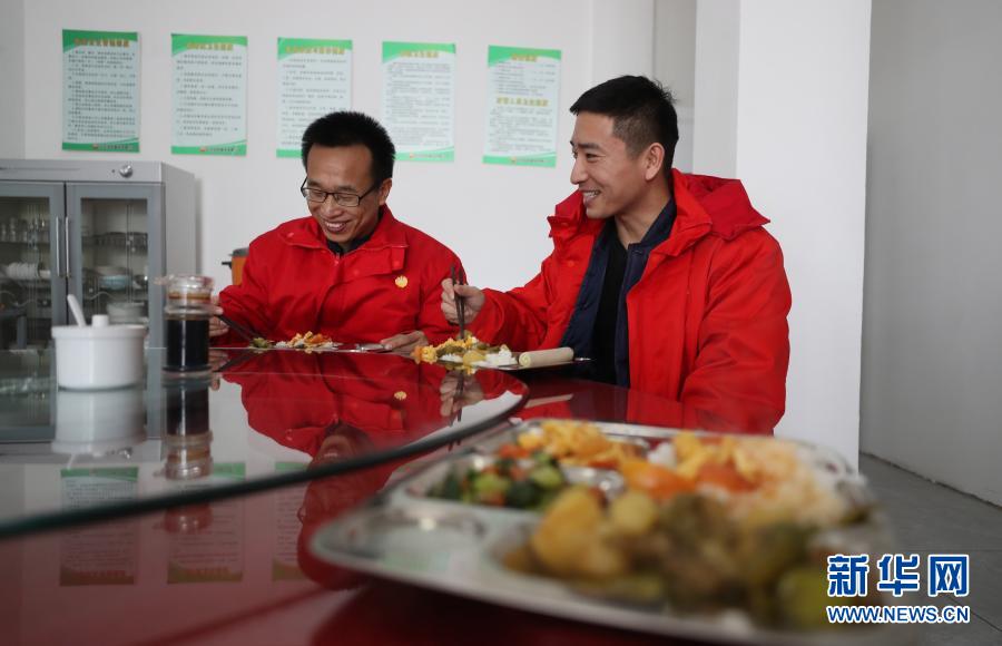 2月3日,在遼河油田建設有限公司管道第三項目部,來自河北衡水的概預算管理人員王殿凱(左)和來自河北邢臺的工程技術人員張浩在食堂吃飯。今年他們都留在當?shù)剡^年。