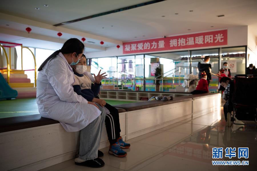 在哈爾濱博能中醫(yī)門診部,劉雨晴(左)和腦癱兒童交談(2月2日攝)。