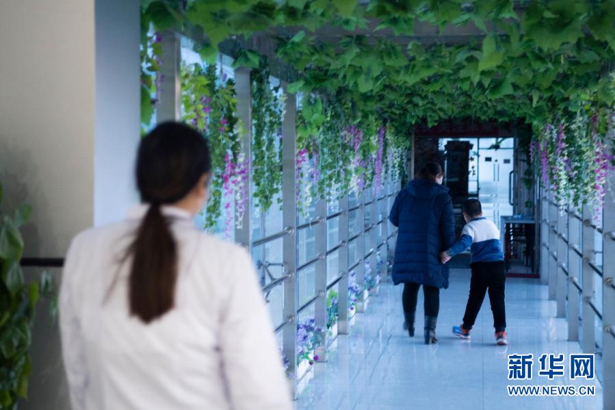 在哈爾濱博能中醫(yī)門診部,劉雨晴(左)在結(jié)束一天的康復(fù)訓(xùn)練后目送腦癱兒童離開(2月2日攝)。