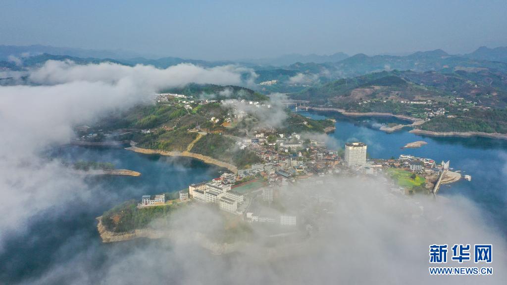 3月28日拍攝的云霧中的流水鎮(zhèn)(無人機照片)。