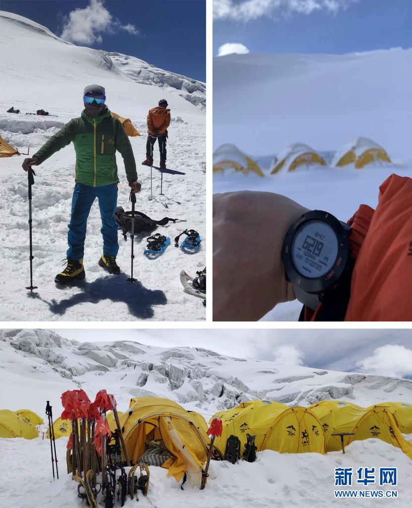 拼版照片:上左為別克米爾扎·圖爾達力在提供慕士塔格峰登山協(xié)作服務(wù)時,由C1營地前往C2營地途中(2019年7月24日攝),上右為別克米爾扎到達慕士塔格峰海拔6200多米的地點(2019年攝);下圖為別克米爾扎拍攝的C1營地(2019年6月22日攝)。新華社發(fā)