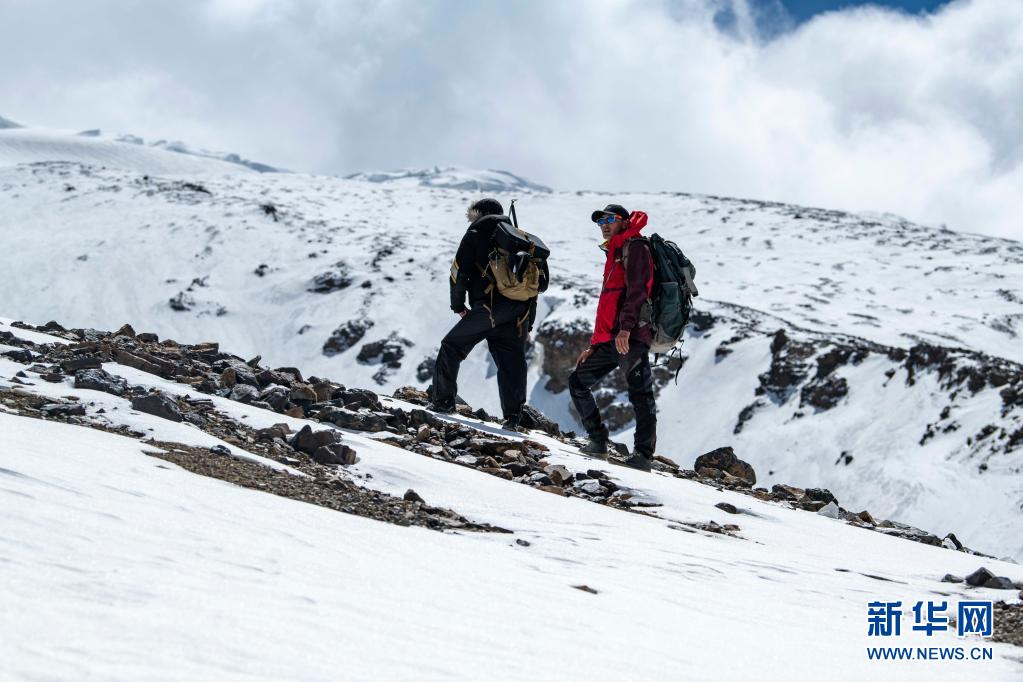在當天的適應性訓練中,別克米爾扎·圖爾達力(左)和同伴庫爾班巴依·努爾麥麥提行進在慕士塔格峰海拔約5000米的山路上(5月15日攝)。新華社記者 胡虎虎 攝